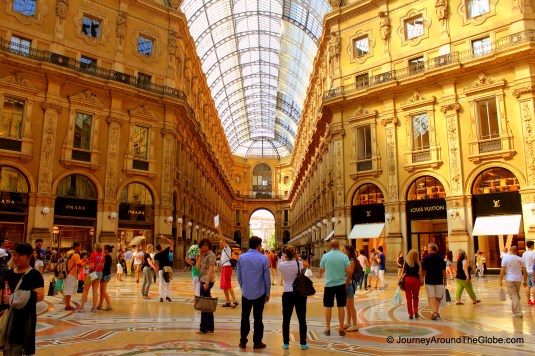 2) GALLERIA VITTORIO EMANUELE II: This is located right beside the Duomo in Piazza del Duomo that has Piazza della Scala on the other end. The two main entrances are marked by imposing triumphal arches. This is considered as one of the most representative architectural accomplishments of the city. Even if you don’t buy anything from this EXPENSSIVE shopping arcade, be sure to visit it anyway to experience this splendid 19th century mall. The arcade is decorated with stunning mosaic floor, arching glass and glazed cast iron roof (very similar to St. Hubert Gallery in Brussels, just a bigger version), and of course with big fashion names like Prada and Louis Vuitton.
