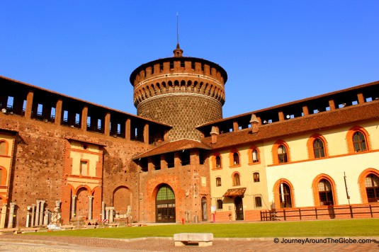 5) THE SFORZESCO CASTLE (CASTELLO SFORZESCO): This is a 14th century castle that once used to be the seat and residence of the Duchy of Milan. The castle was heavily damaged in 1943 during WWII and was later reconstructed by the city. There is no fee to enter its huge courtyard, where Ducal Court (Corte Ducale) and The Tower of Bona of Savoy stand. Presently, the castle houses several different types of museums and art collections, like Egyptian art, fine arts, applied arts, ancient art, and many more. Museums are open from 7-6pm everyday and closed on Monday. This is located very close to the last station of Bus # 50 (Cairoli) and situated in between Sempione Park and Via Dante.