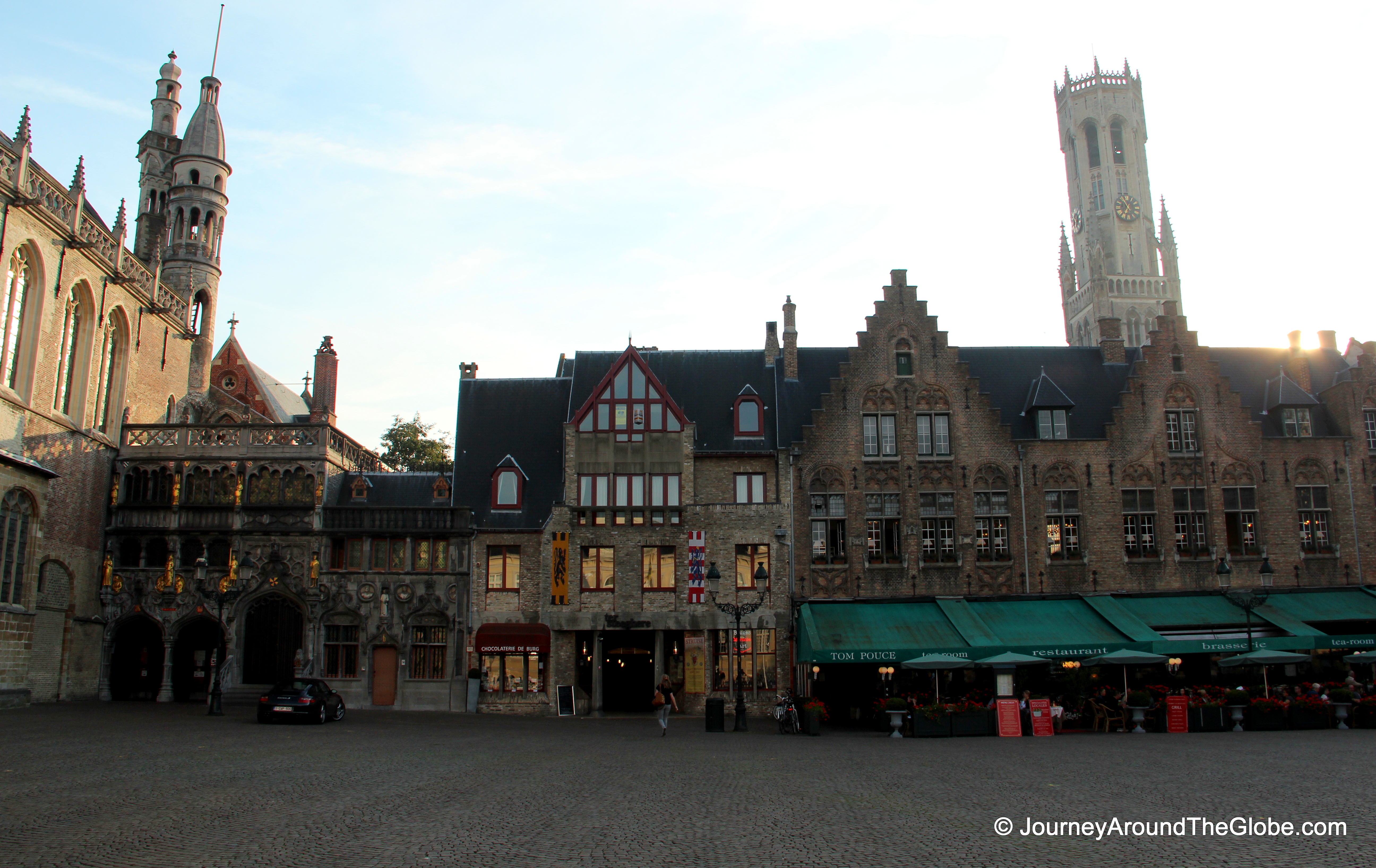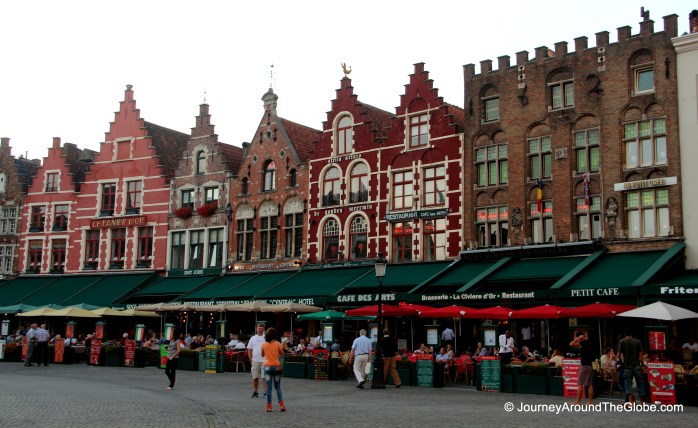 Typical Flemish style buildings and cafes in Grote Markt, Brugge, Belgium
