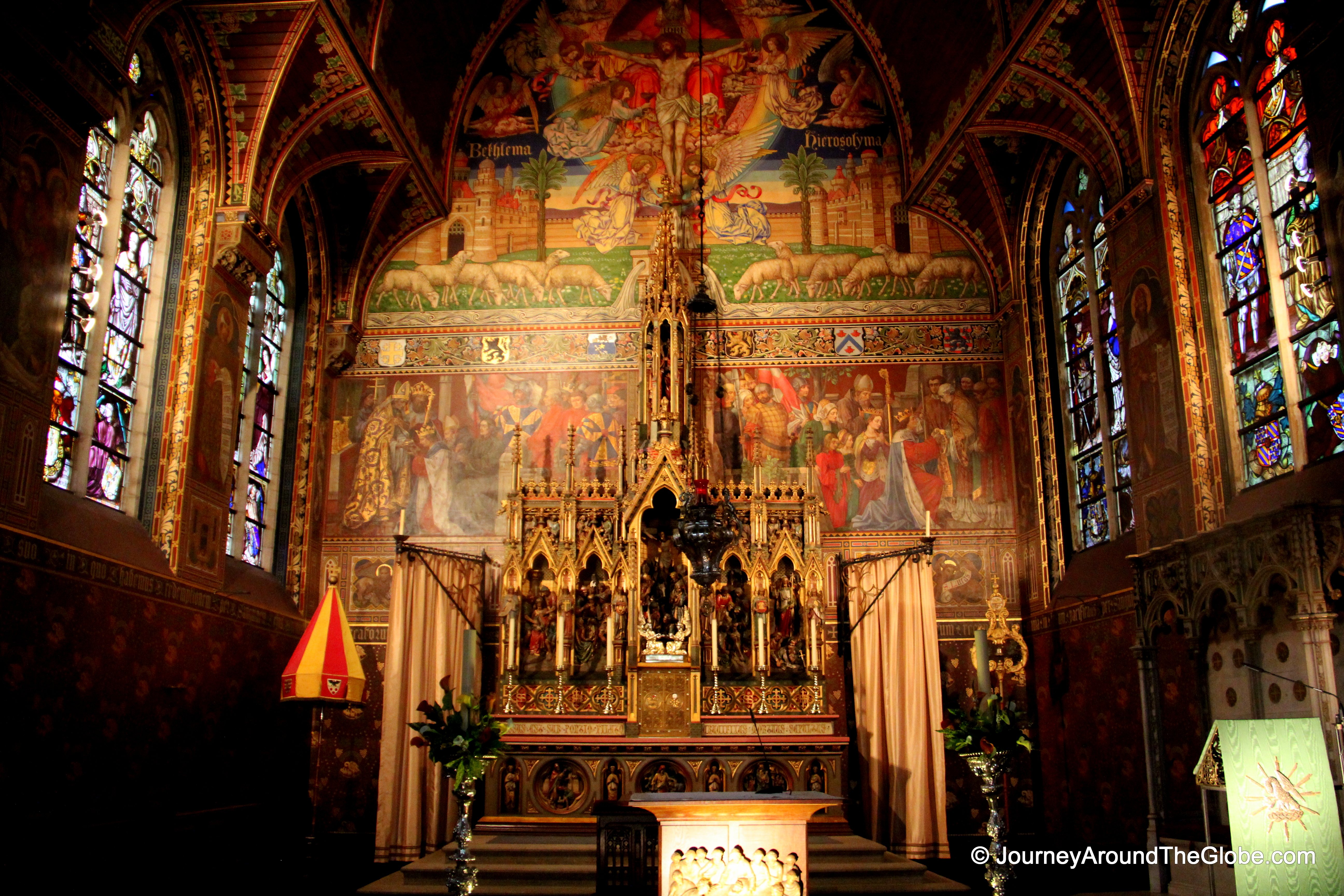 The main altar of upper chapel of Basilica of Holy Blood in Brugge, Belgium