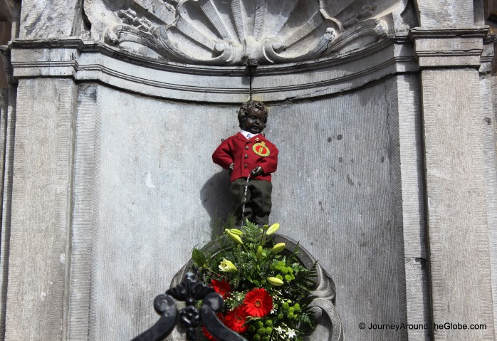 Mannekin Pis in the heart of Brussels near Grand Place, wearing 1 of his more than 800 outfits
