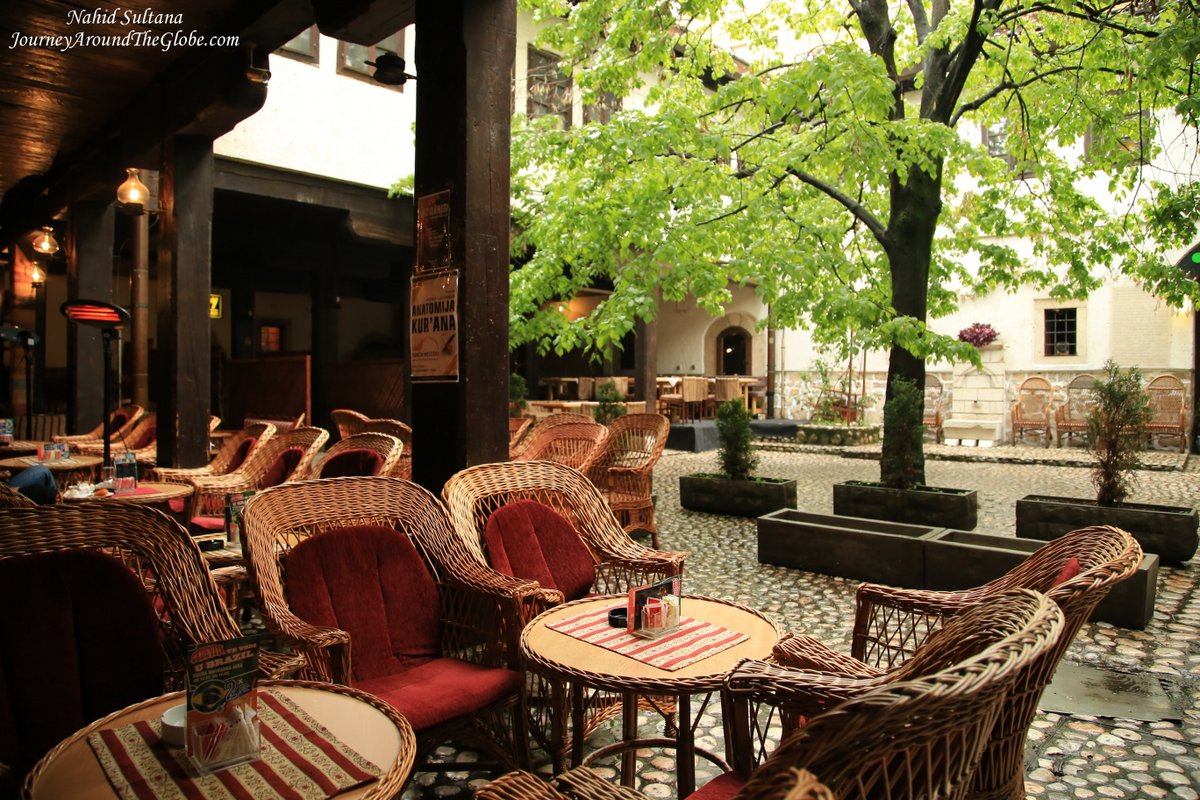 7) MORICA HAN (SARAY): This is the only preserved Ottoman Inn in Sarajevo. This used to be a hotel/inn in the 18th century. Now, there is a big restaurant, a Turkish carpet shop on the first floor along with some old hotel rooms, and a big courtyard with lush trees in the middle. We took the old wooden stairs to go upstairs. This is where guests used to stay overnight during their journeys couple centuries ago. Presently, there are some offices which we couldn’t access.