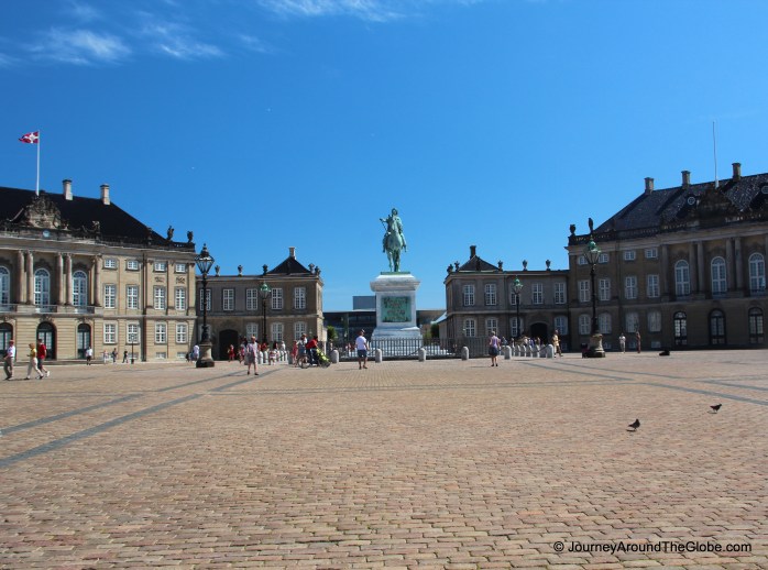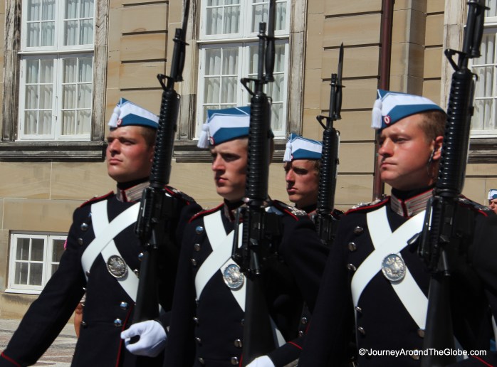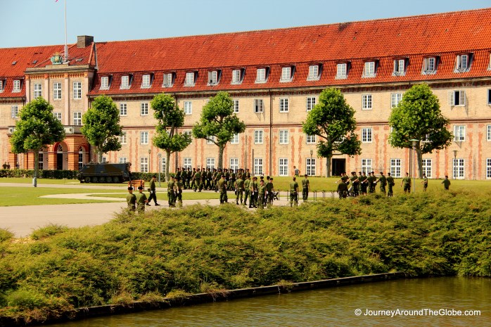 b. AMELIABORG: The palace is very beautifully situated by a big canal. The 4 buildings of this whole palace were built somewhere in the 18th century. The palace is not open to publics since, this is the OFFICIAL RESIDENCE of Danish Royal Family. There are some museums that are accessible by the tourists. You can see uniformed Royal Guards walking in front of each buildings and see change of Guards every day at noon and 2 pm.