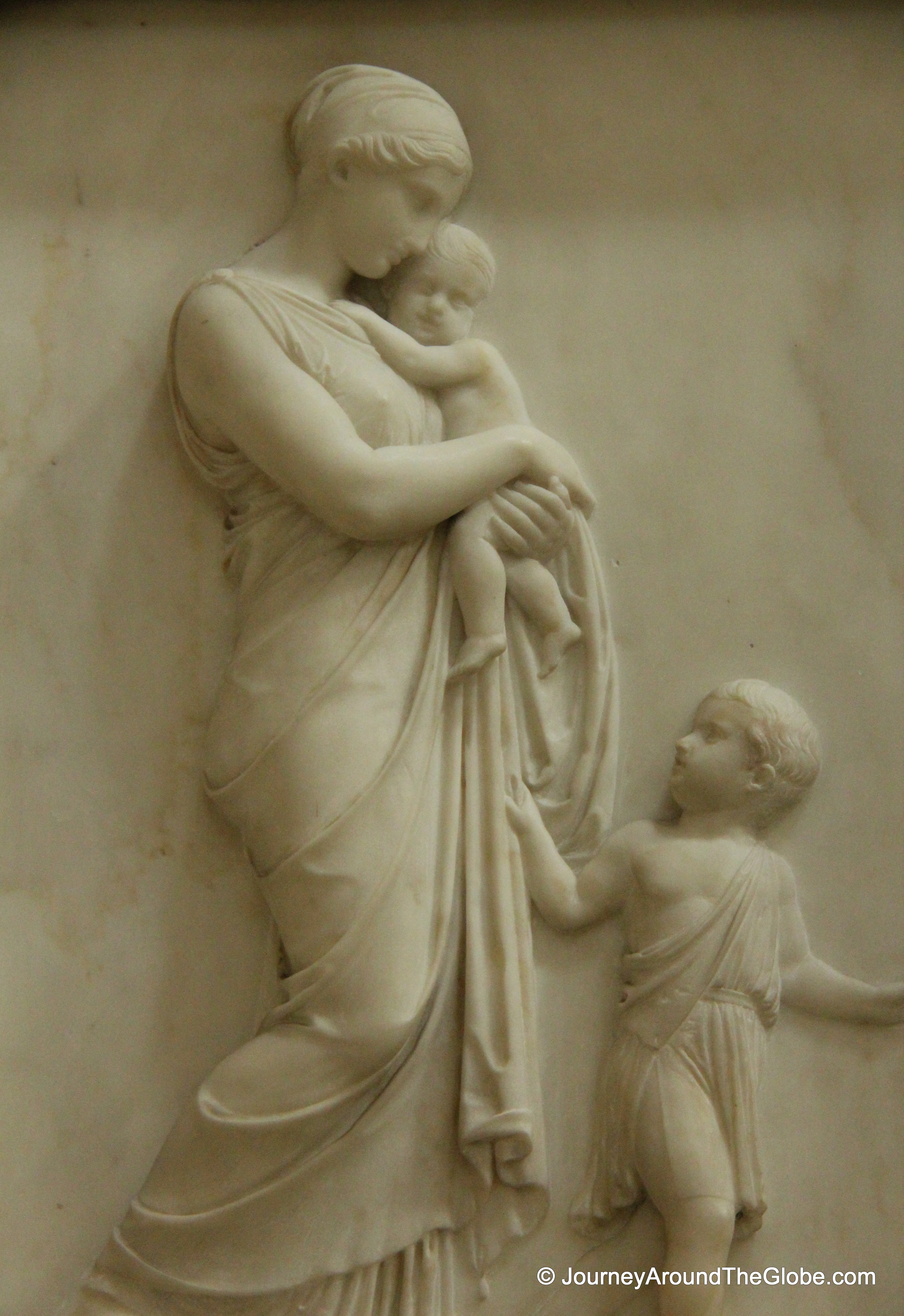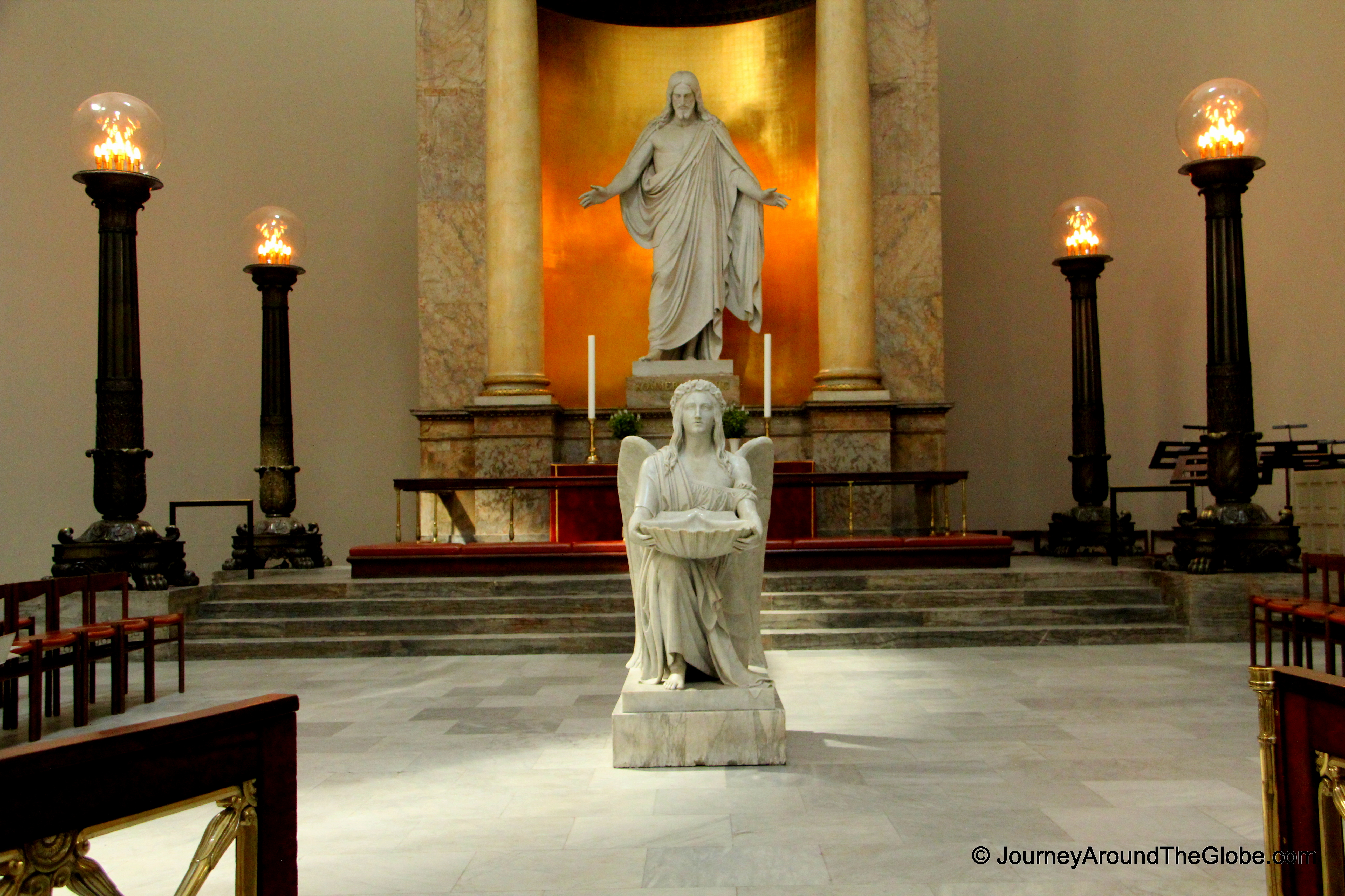 b. CHURCH OF OUR LADY (VOR FRUE KIRKE): Also known as Copenhagen’s Cathedral, this national cathedral is situated in Vor Frue Plads and next to the main building of the University of Copenhagen. This church has been built four times on the same place since 1209. The cathedral had been associated with the Royal Family for a long time where their ceremonial events such as crowning and weddings took place. The tower is 60 meters high and houses 4 church bells weighing over 4 tons and are the largest bell in Denmark. The smallest bell in the tower is the oldest bell in the country, dating from 1490. The façade of this cathedral is built is neoclassical style with 4 columns supporting the prestigious pediment from mid-19th century. There are 2 statues of Moses and King David on the 2 sides of these columns.