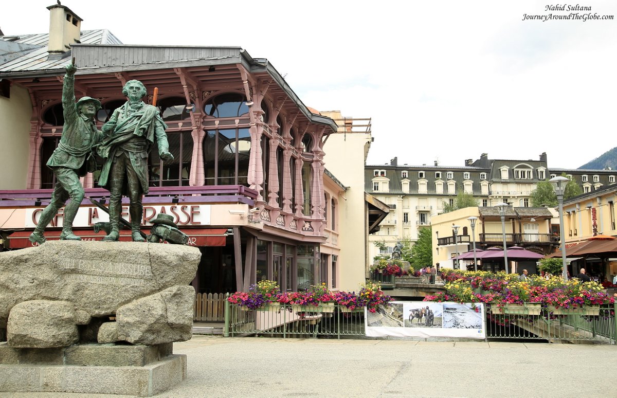 2) STATUE of de SAUSSURE: This is a statue of heroism and bravery in the center of Chamonix in front of a casino. It honors Horace Benedict de Saussure who was the first person to climb Mont Blanc. The statue portrays Horace Benedict de Saussure, beside him Jacques Balmat standing, pointing his finger towards Mont Blanc.