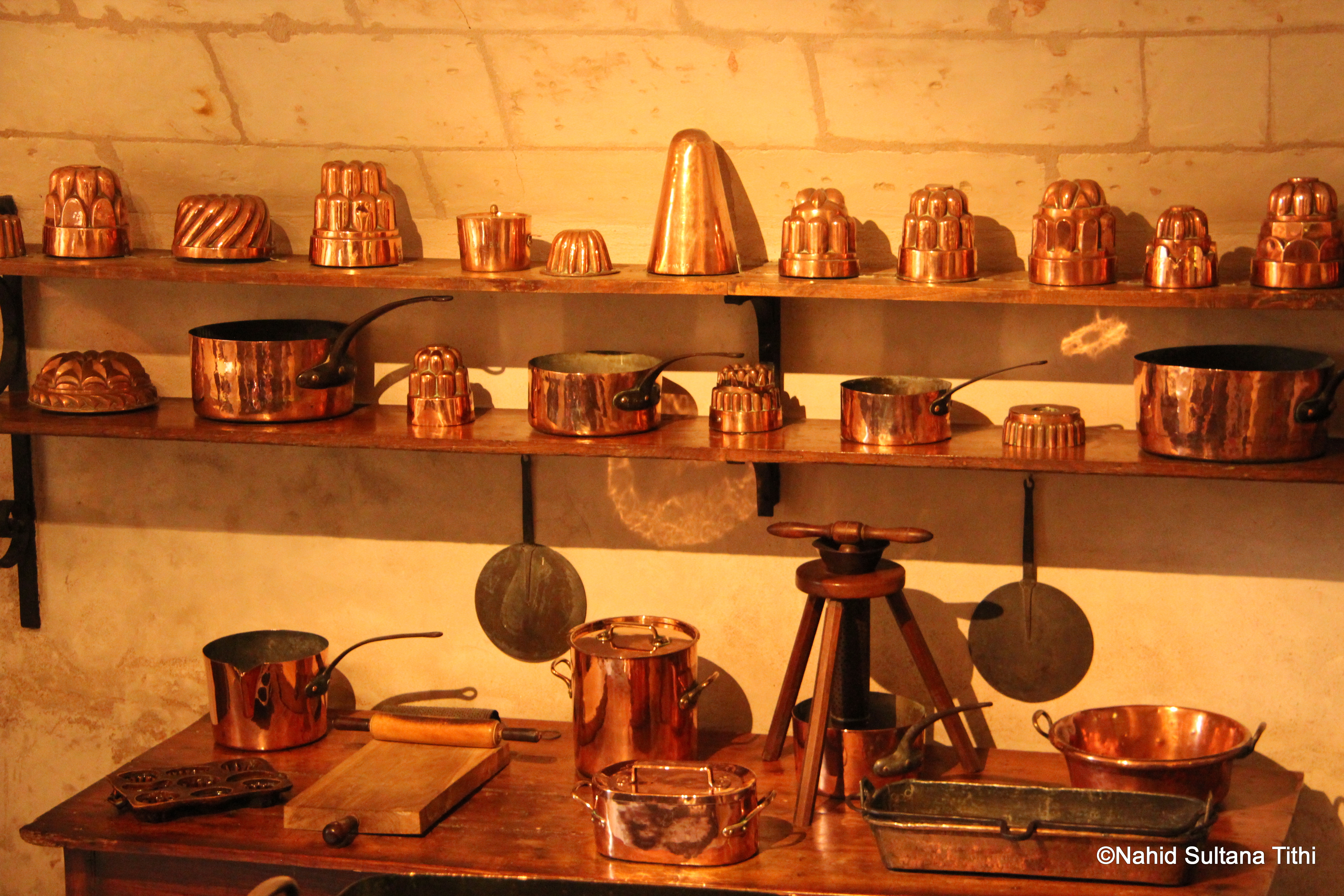 The Renaissance style Marques Tower on forecourt and the old main door are noteworthy. This probably has one of the most unique exterior designs in Loire Valley, with several arches, for being built right on Cher River. Two floors of this place are accessible to tourists. There are lots and lots of Belgian tapestries from the 15th and 16th century on display in most of the hallways and rooms. The big baskets of floral displays add more sense of elegance in each room. It’s very beautiful to see River Cher and the woods from almost any of the chambers. All the rooms here are very modestly furnished and decorated. Out of all the rooms we’ve visited (guard’s room, chapel, library, gallery, several bedrooms, King Louis XIV’s drawing room, hallway, staircase, exhibition room) in Chenonceau the kitchen area downstairs was my favorite one. The odd-sized pots and pans made with brass, original oven, old kitchen utensils are fun to see.
