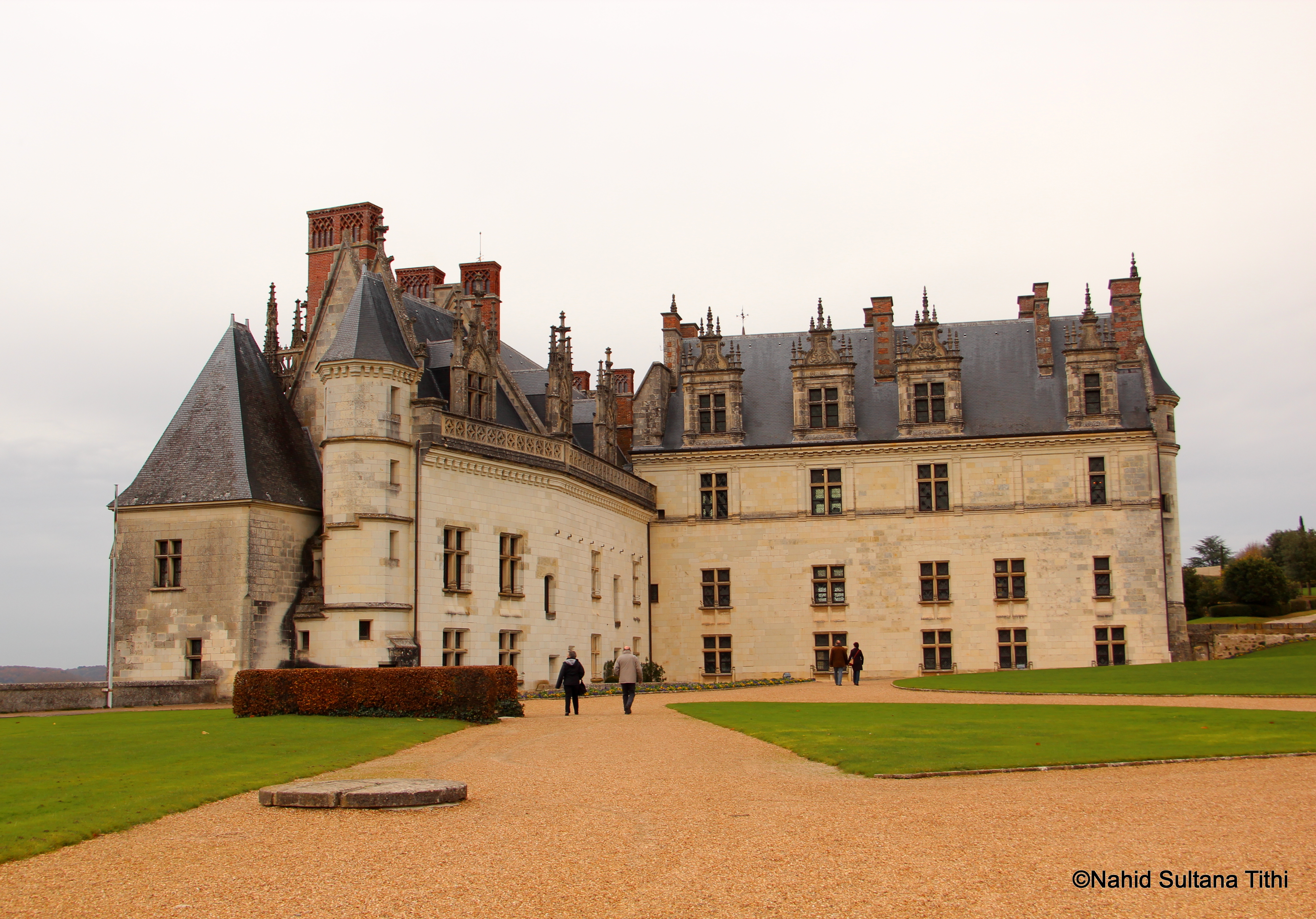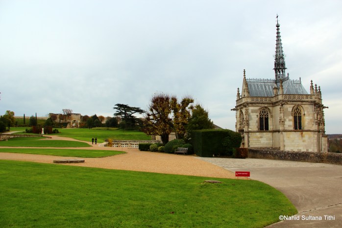 After visiting the Royal apartments and two imposing Cavalry towers, we took a stroll in the panoramic gardens. The château rises over its surrounding town and therefore, gives an overlooking view of the Loire River, buildings from the 15th/16th centuries, and the city of Amboise. Do go inside the small, square-looking chapel, St. Hubert Chapel, with a Gothic spire and an old entrance with Late Gothic carvings. Leonard de Vinci’s tomb is located in this chapel, as I mentioned above.