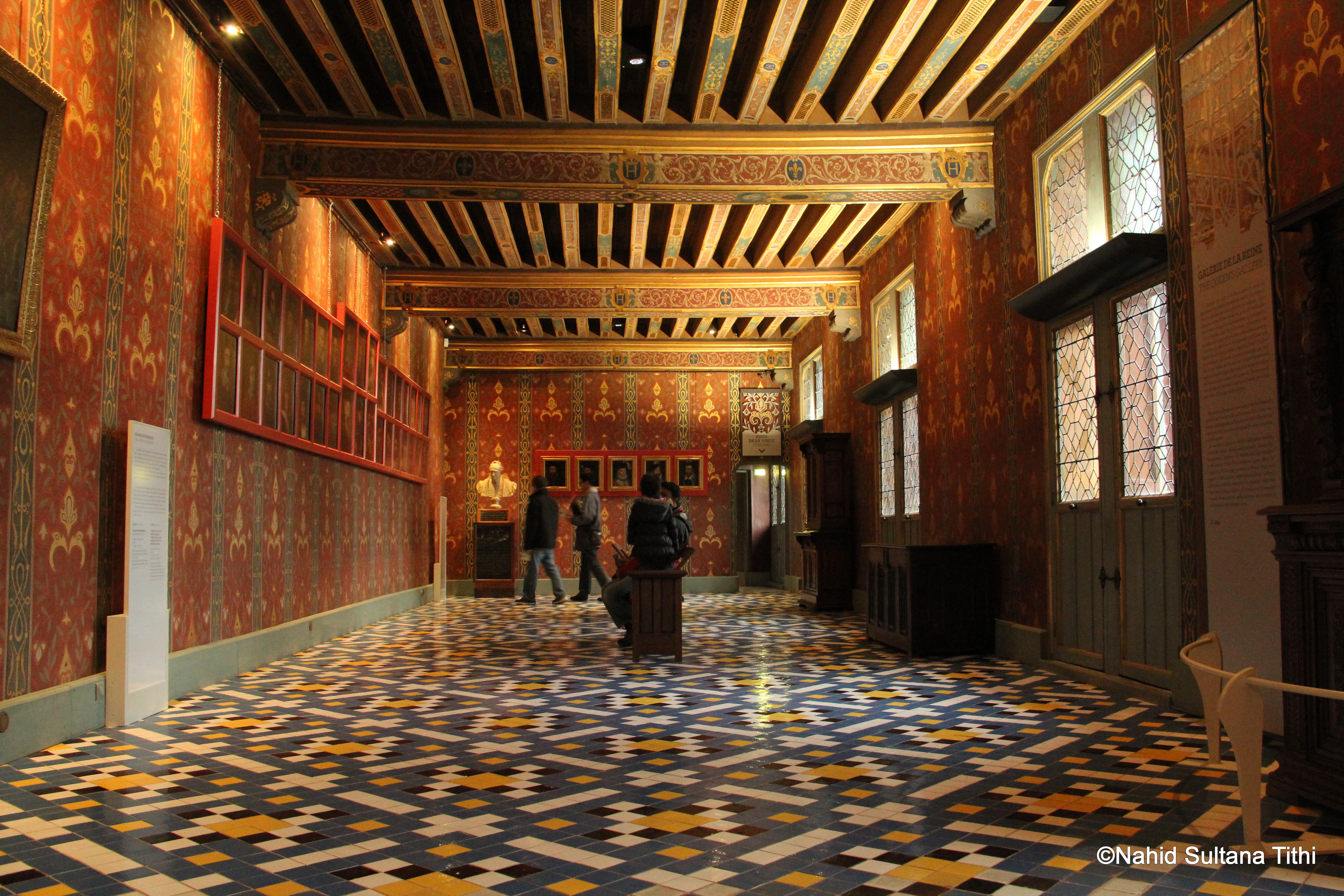 Interior of Blois is probably one of my favorites among the 6 chateaus we visited. Go inside each of the wings to experience different era and style. Copula of “Classicism” wing of Blois is a masterpiece of French Classical architecture. The staircase of the Renaissance wing with its spectacular double vault is decorated with few sculptures. Chapel St. Calais at one end of “Flamboyant” wing was consecrated in 1508 but the stained-glass windows are rather new from the mid-20th century. Inside Château de Blois, all the rooms are very gorgeously and elegantly decorated with artistic ceilings, rich furniture, large portraits, paintings, luxurious upholsteries, and table tops. My favorite was the exquisite wall-papers in all the rooms. They are not too brightly colored; just perfectly graceful and royal to display the utmost sophistication.