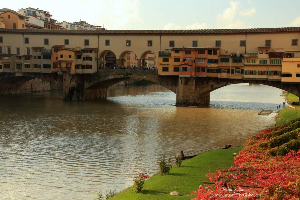 The uniqueness of this bridge come from the small, projecting shop windows featuring jewelry with their old-fashioned shutters and doors. This was the only Florentine bridge that survived WWII bombing raids, but the two areas at either end were destroyed.