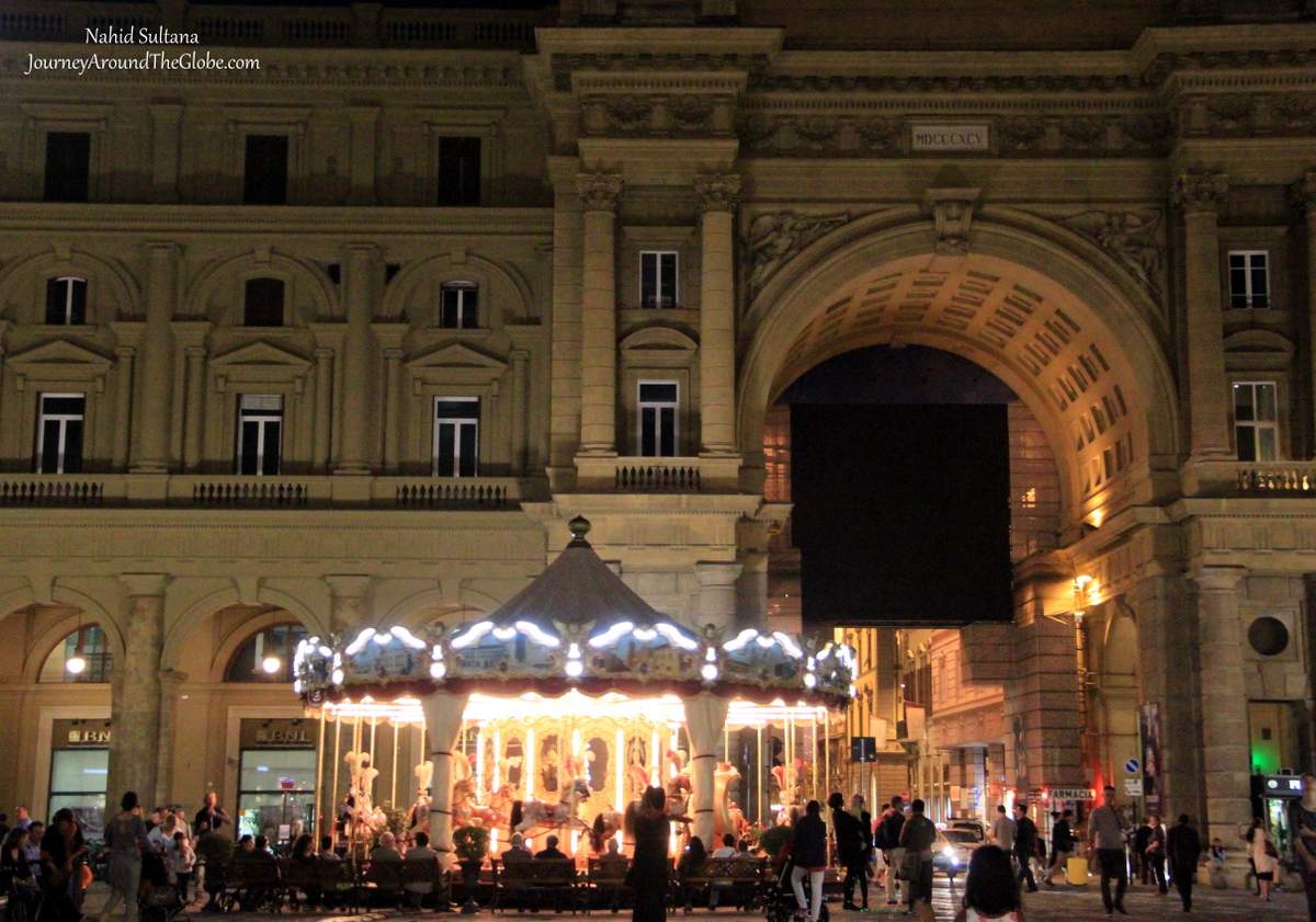 8) PIAZZA della REPUBLICA: This was one of many piazzas of Florence and a beautiful one too. We were there around evening, after visiting all the above places. While my girls hopped on to the merry-go-round, I went around the square to enjoy some live music. There is a big arch/gate at one side of the square. I found many cafes, restaurants, and shops where I only wish I could spend hours…only if I had that much of time.