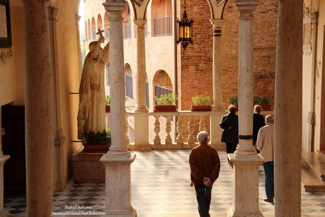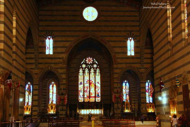 3) BASILICA SAN FRANCESCO: About 7/8 minutes of walk from Piazza del Duomo is Basilica San Francesco. It was quiet and empty when we were there late in the afternoon. But the oversized paintings and gorgeous altar with black and white interior immediately caught our attentions. It was a bit similar to Sienna Duomo but a simpler version.