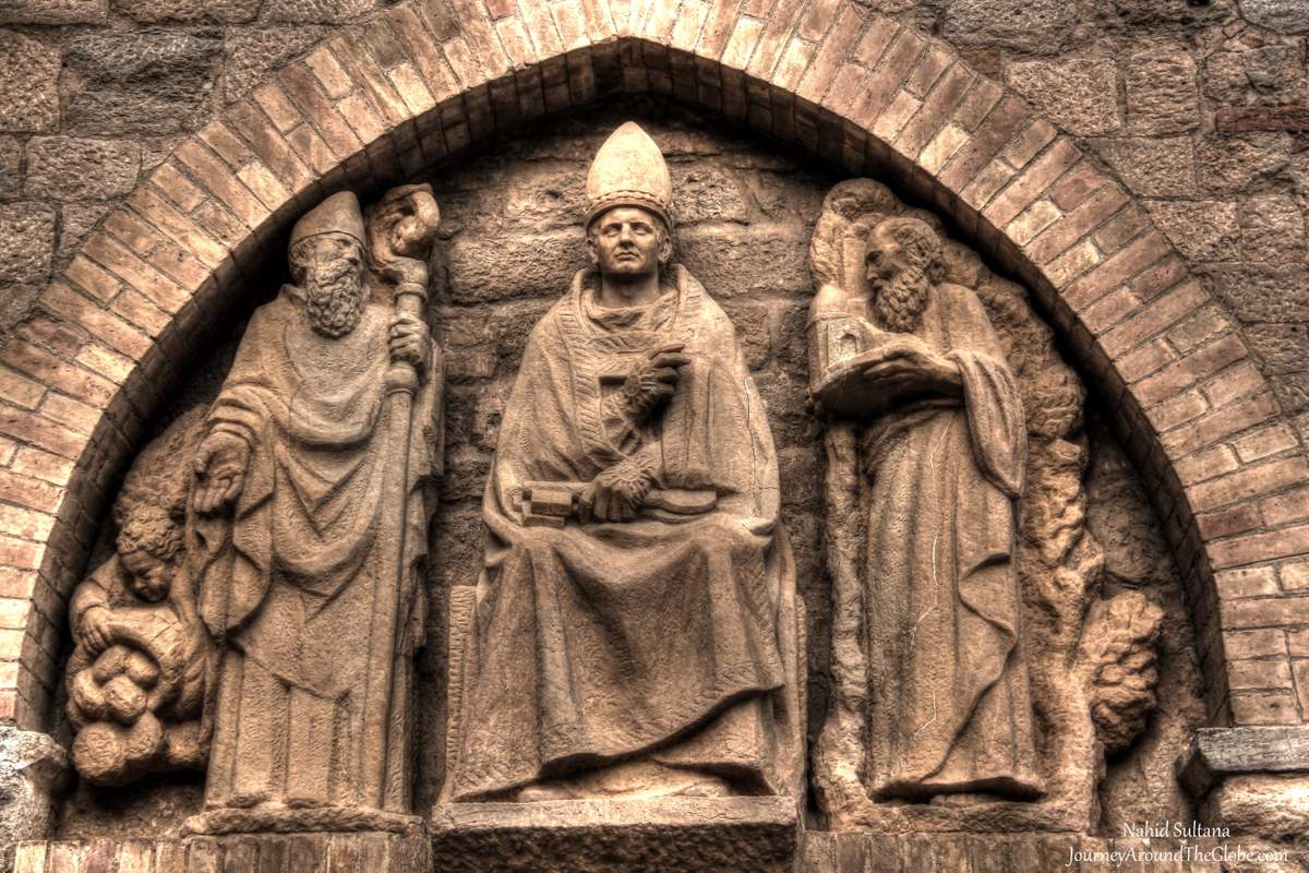 2) MARIA ASSUNTA CHURCH CATHEDRAL: After the piazza, we walked few minutes following the sign to go to the Duomo or Santa Maria Assunta. The first mention of Church of the St. Mary dates back to 992 AD. This is a Parish cathedral of Volterra in the heart of the town. Some of the most important sites of this church are the main altar, splendid pulpit, Bishop’s chair, and mesmerizing ceiling, which represents the heaven. The interior differs from the exterior in that only a little of the old Romanesque structure remains in it. There is a Baptistery in front of the Duomo and they both are located in Piazza San Giovanni. Inside the Duomo was very dark and Gothic looking. It was about to close, so we entered and exited after getting a quick peek inside the Duomo. Both the Duomo and the Baptistery are free to enter. The Baptistery was very small, had a marble wall and a painting…another brief look for me.