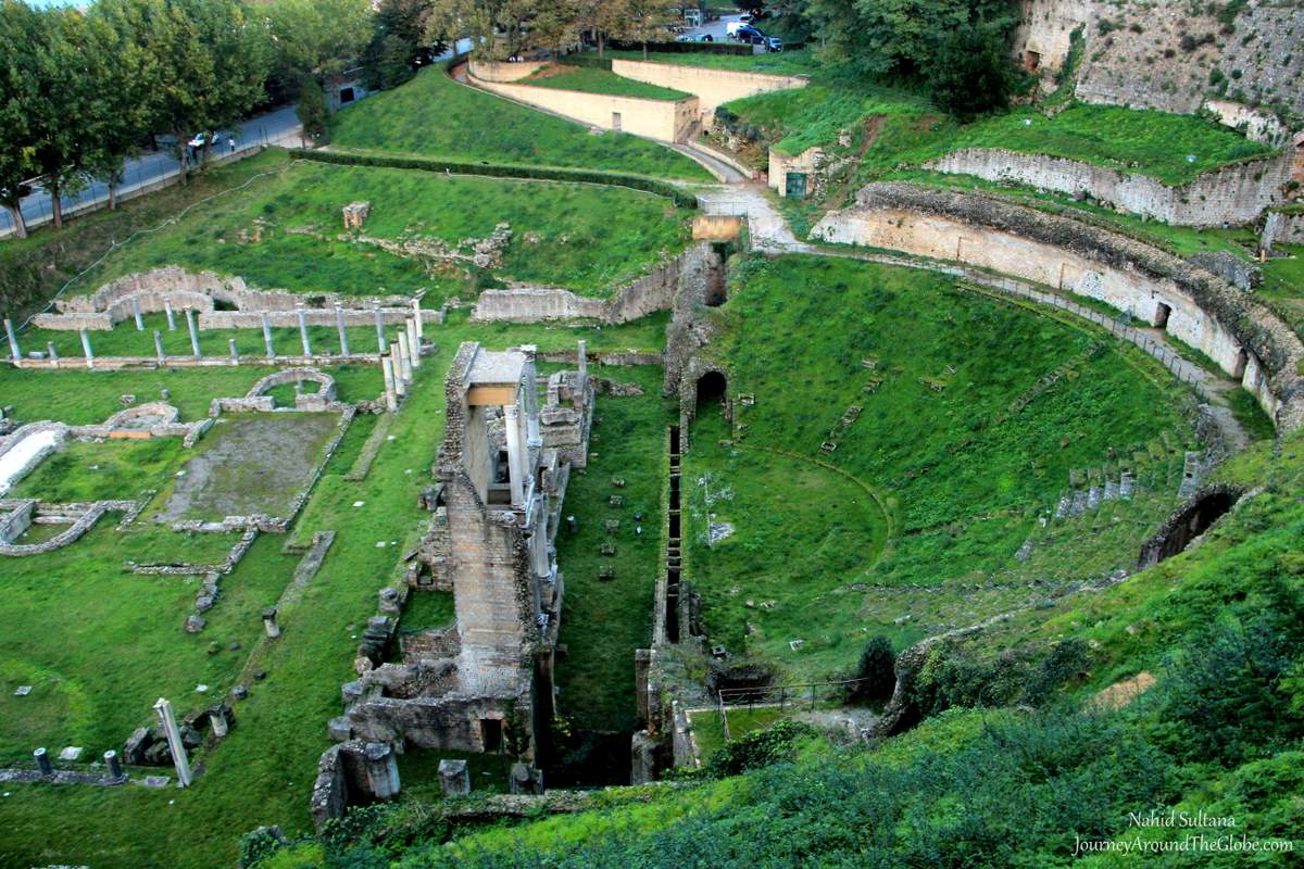 3) ROMAN THEATER: Roman Theater was about 10 to 15 minutes of walk from the Duomo. It was only ruins and the site was not a well-maintained area. We saw some ancient columns and grass-covered steps from the Roman times. Tourists can walk and go closer to the decayed site. We only browsed it from up above, where you can stand and enjoy some other views as well.