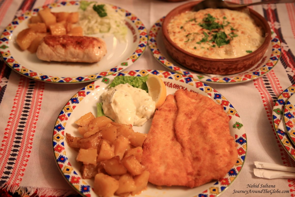 EATING and SHOPPING: “Shkembe” is somewhat popular here since I’ve seen it in the menu of few restaurants. This soup is made with cow intestine (may be lamb too, not sure)…didn’t dare to try it. Other than that fried cheese or Greek salad are also common in many restaurants. We had our first dinner in “Macedonian House”, a place which was recommended by our hotel owner. This is a top class place to try some traditional dishes. It is a big place decorated with traditional and handcrafted items from the locals. We had breaded cheese, chicken casserole, rolled chicken with cheese, eggplant with feta, fried zucchini, and onion soup. The price was way less than our expectation and the service was fantastic. There was also some live piano at the end. Next day lunch was in the old town opposite of Daut Pasha Double Hammam. This was a small street-side place with good food. We had some hot dogs, Greek salad, and breads. Again, price of the food here is a lot cheaper than Western Europe. Next day we had lunch in Canyon Matka Hotel and Restaurant when we went to see Matka Canyon and Lake. This is a pleasant place for meal by the lake. It’s a bit pricey but the food was great. There were more options near the entrance of this canyon.