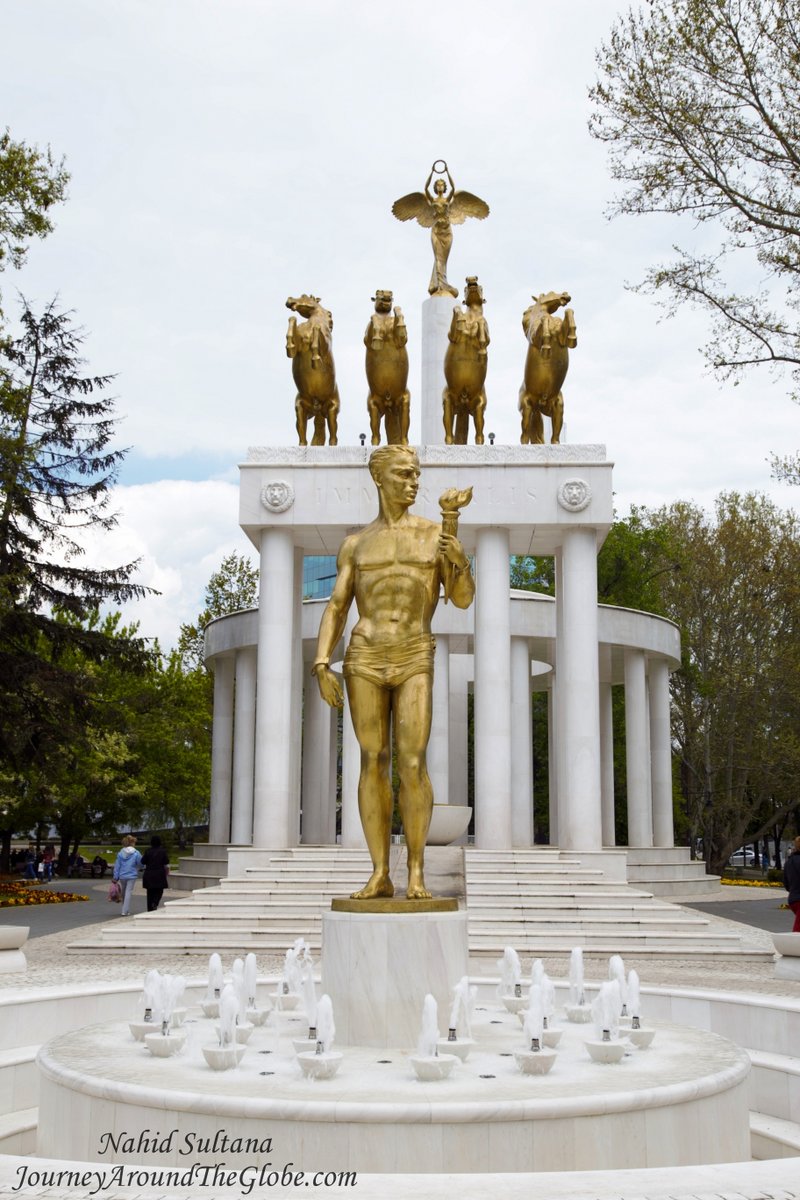 3) MACEDONIAN PARLIAMENT: We walked a bit from the memorial to come here. Macedonian Parliament is a pretty nice rustic orange building. In front of this modernistic style parliament stands a statue of Nikola Karev on the back of his horse – a Macedonian revolutionary and socialist who perished in the war with the Turks. Opposite of the parliament, on the other side of the street is like a big memorial park – a complex of many statues. The biggest one there, facing the parliament is known as “Monument to the Fallen Heroes of Macedonia”.