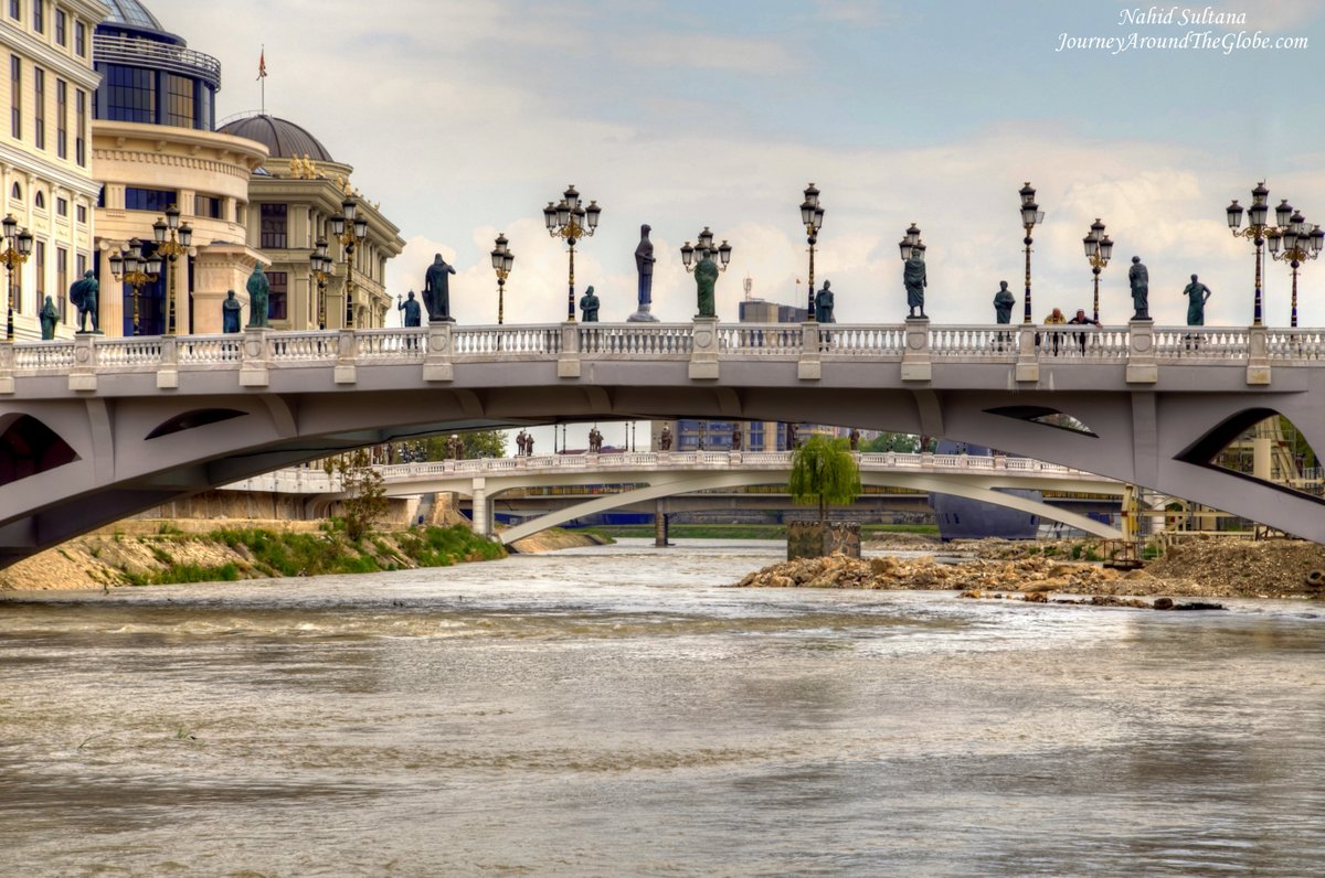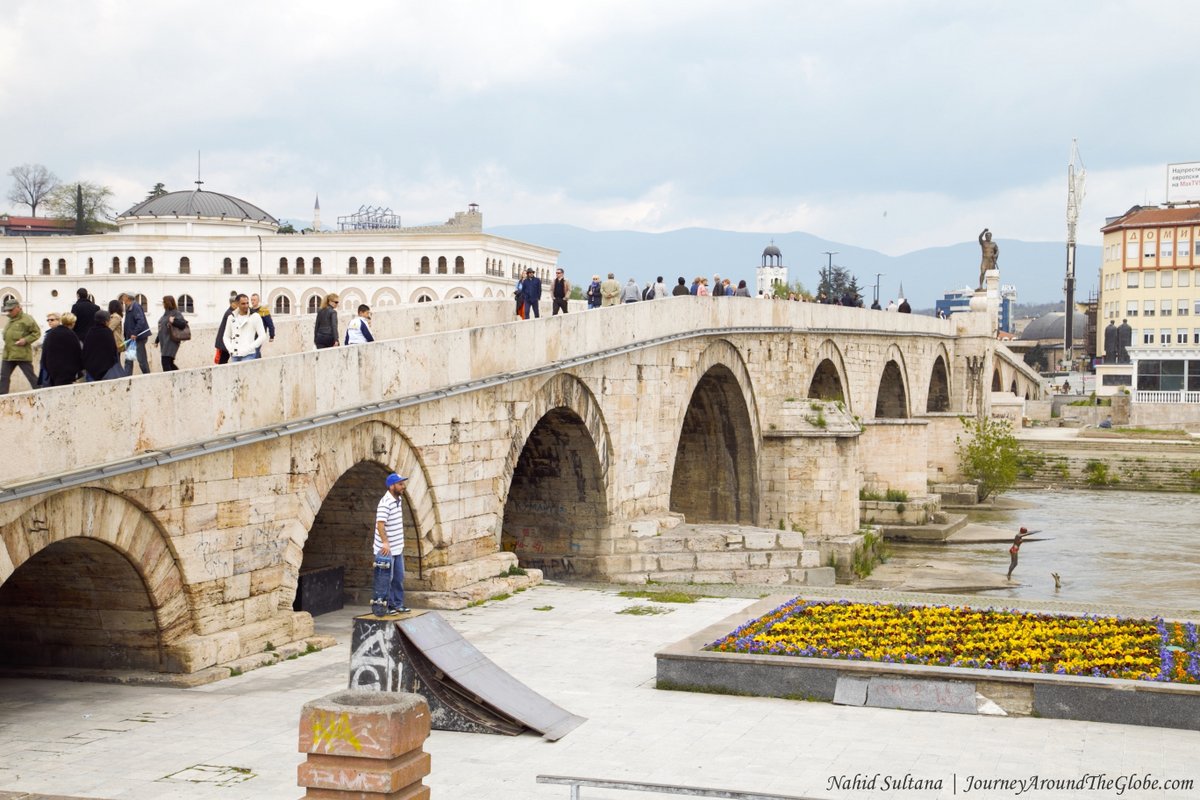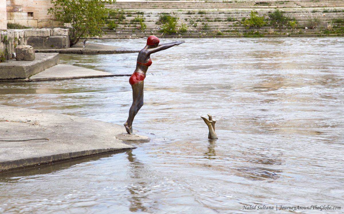 5) STONE BRIDGE and RIVER VARDAR: Another beauty of Skopje is their old Stone Bridge on River Vardar that connects old bazaar and main square. The original bridge is from the 6th century, from the Byzantine’s period; different reconstructions and renovations took place in the later centuries. The Watch Tower shaping like a Mihrab was reconstructed in 2008. You can see the original 6th century stone block and 13 arches of this bridge from the sides. Many important and historic buildings stand by the river bank. River Vardar cuts thru the city here and creates a pleasant place to hang out at any time of the day. There are tons of interesting statues on the both sides of the bridge and near the water. Look for the statue of a lady posing to dive into the water.