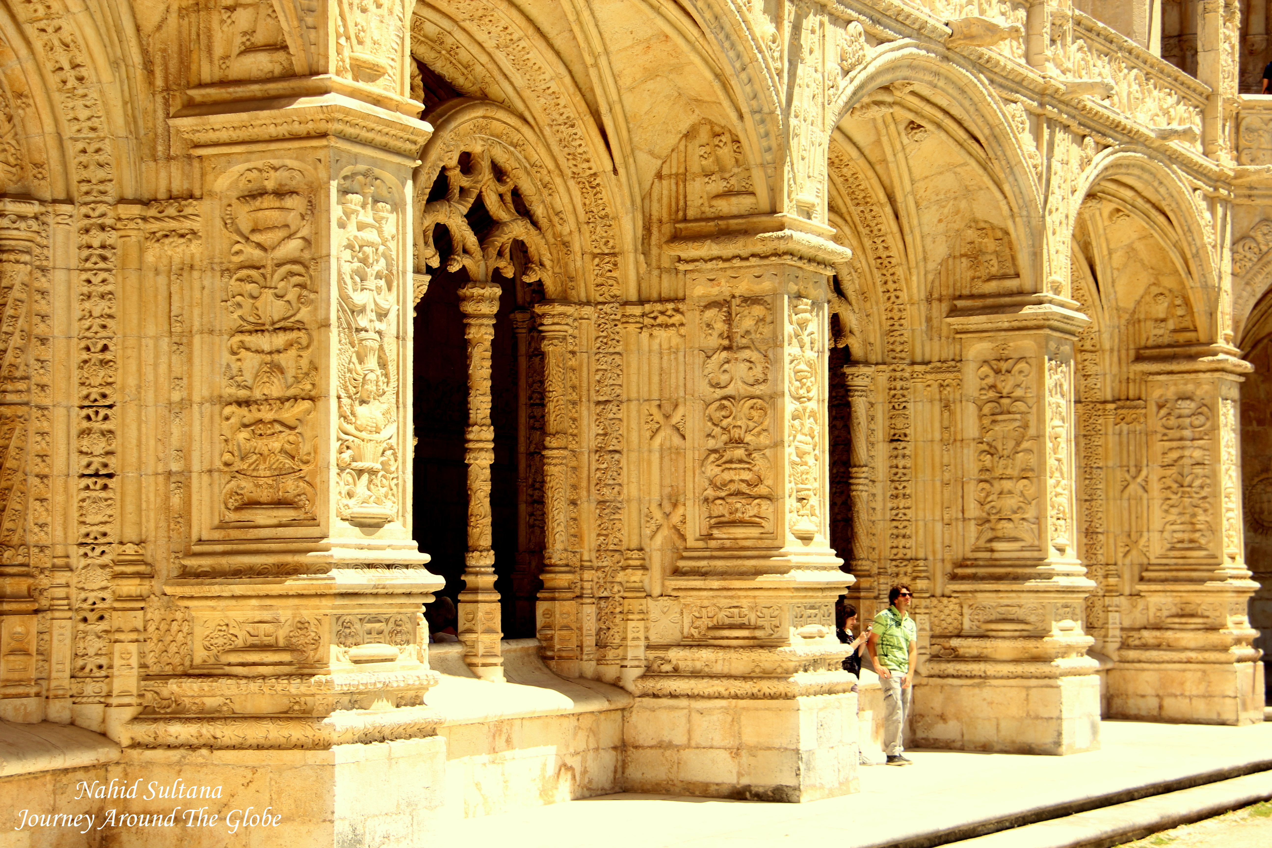 5) JERONIMOS MONASTERY (MOSTEIRO dos JERONIMOS): This is another national monument of Lisbon from the 16th century and an UNESCO World Heritage Site. You can’t leave Lisbon without visiting Jeronimos Monastery. It was built to create a pleasant place of meditation and recreation for the monks. The cloister of it was finished in 1541. Due to its value and symbolism the Cloister is considered to be one of the jewels of the Manueline style. Stone curved vaulted ceilings, rope, plant motifs along with imagery of fantastic animals on the walls, and peaceful courtyard give its guests some inner-peace and tranquility. Few portions of the monastery still display old ceramic tiles on the walls. Two levels of Jeronimos Monastery is really very atmospheric and a perfect place to find yourself in a serene surrounding. There were some small displays and temporary/permanent exhibitions during our visit. But we didn’t go to any of them…we were busy enjoying the monastery itself.