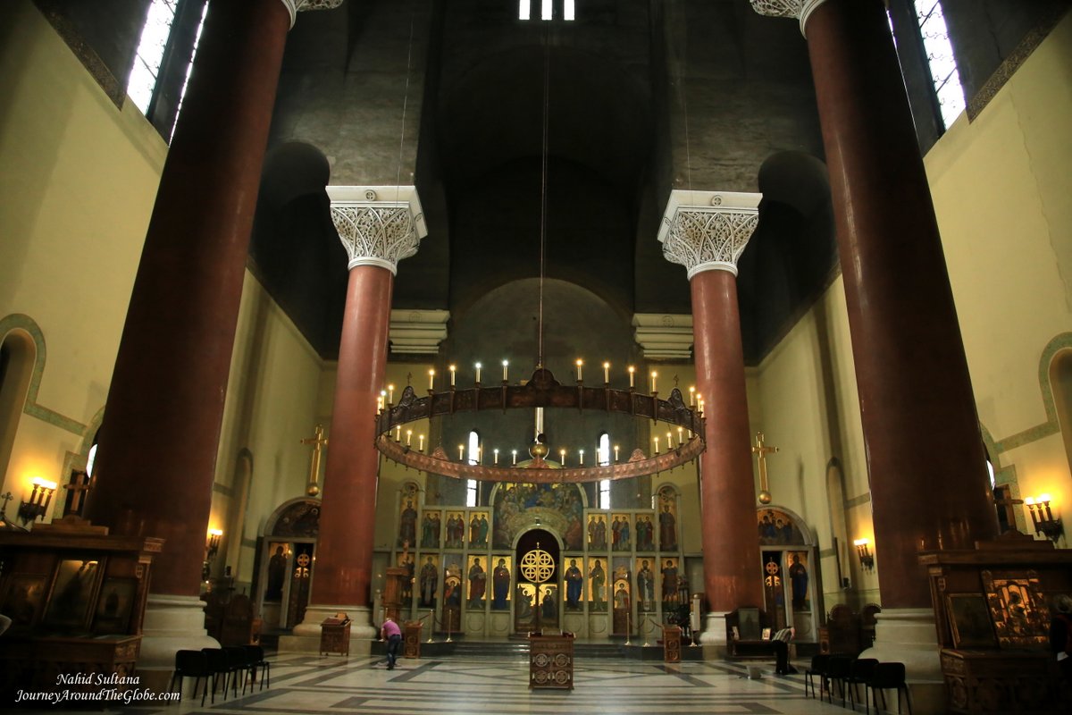 3) BELGRADE CATHEDRALE: From Kalemegdan we started walking towards Knez Mihailova Street again and from there we just followed the crowned steeple of Belgrade Cathedral. This Serbian Orthodox Church is also known as St. Michael’s Cathedral. Interior of the cathedral is very ornate and luxuriously decorated. Stained glass windows with different saints’ portraits, decorative altar, painted walls and ceilings…everything is very richly adorned. There is no charge to enter and it’s located opposite of Residence of Princess Ljubica. Taking pictures inside is not permitted.