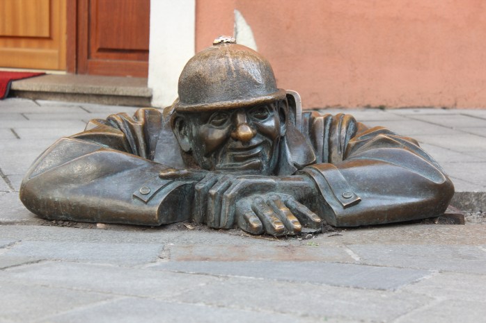 “Man at Work” statue in old town in Bratislava, Slovakia