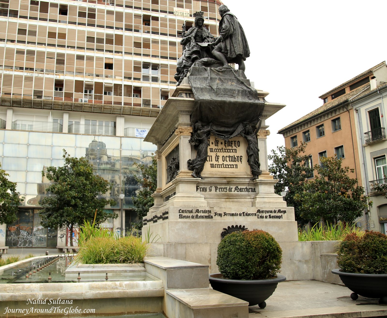 1) PLAZA ISABEL la CATOLICA: This is the central square of Granada, very close to the cathedral. The prominent statue in the middle of the square depicts the moment when Christopher Columbus asked permission from Queen Isabel to go and explore the Americas and outlines their agreement in preparation of his voyage. According to some historians, this even took place in Granada. A pleasant fountain surrounds the statue.