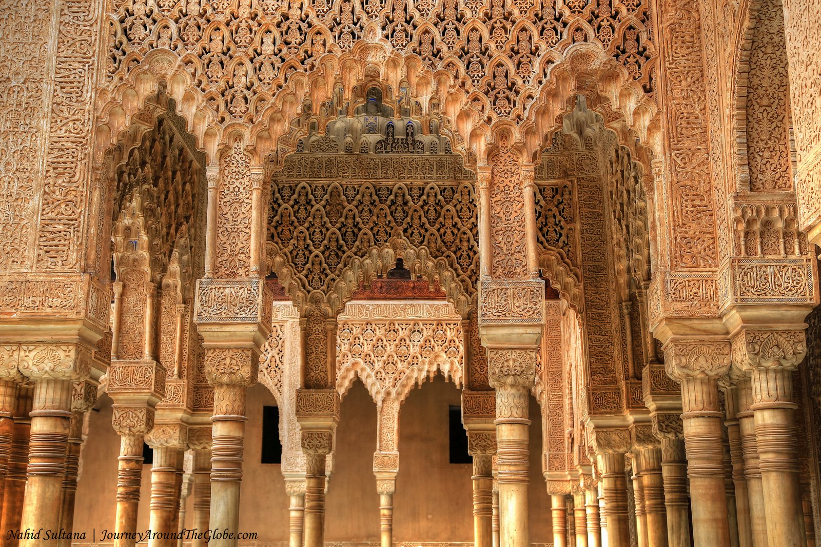 “The Fountain of the Lions” is one of the most beautiful courtyards of Nasrid Palace. This unique hydraulic device from the 14th century was created from marble for Sultana Muhammad V. A beautiful poem by Ibn Zamrak adorns around the edge of the twelve-sided bowl of the fountain supported on the backs of twelve lions which defines the fountain as a sculpture of pearls.