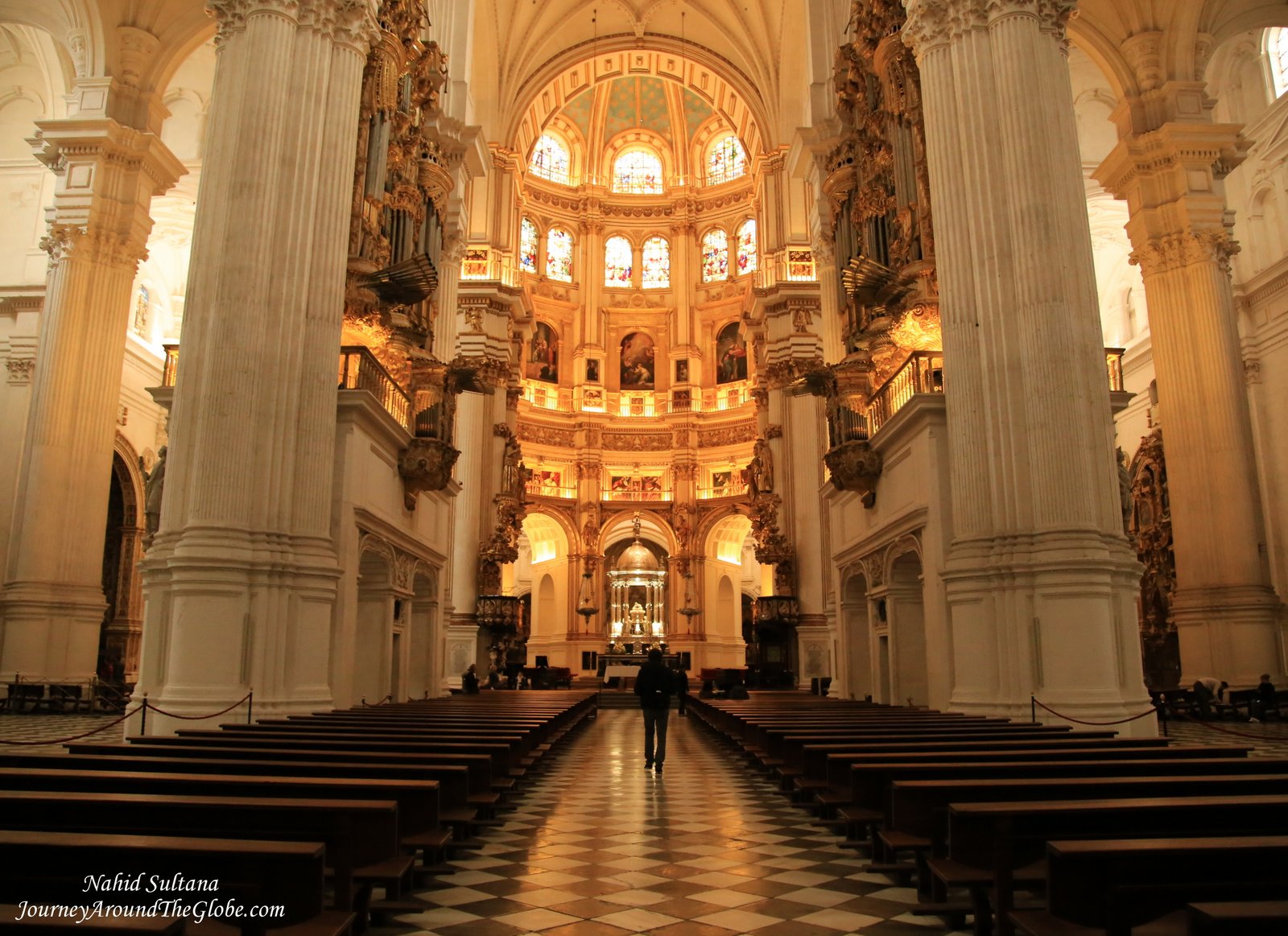 5) GRANADA CATHEDRAL: We were done with Alhambra by 2:30 pm, had lunch, and walked over to the cathedral. This is a huge edifice in the center of Granada surrounded by Moroccan markets and other stores. The cathedral is a mix of architectural styles from different eras. A portion of Granada cathedral occupies the site where the Major Mosque of Granada used to stand. The central part of it is covered by a hemispherical dome and the four sides of the transept by domical vaults. The present Baroque look of it is from 1705. Inside the cathedral looked a bit simple to me, but beautiful with white and golden combinations. Organs and the main altar were gorgeous. Royal Chapel of this cathedral houses tombs of King Ferdinand II and Queen Isabella I, the Catholic monarchs who conquered the city against Muslim rulers.