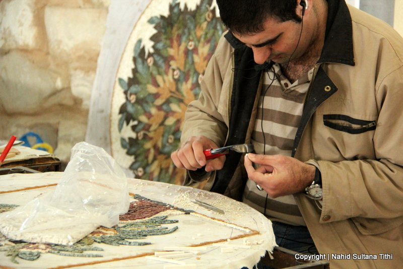 An artist cutting stones to make designs on a mosaic decor in Madaba Handcrafts Center, Jordan