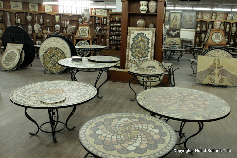 b) MADABA HAND-CRAFTS CENTER: As I have mentioned above that if you want to buy Madaba’s traditional hand-crafted mosaics then it’s better to go to a factory other than buying cheap, fake stuff from small shops on the streets. There are plenty of these government approved places here who will gladly show you around their factories and then bring you to their showrooms. Our driver/guide took us to one such place, called Madaba Hand-Crafts Center. All of the mosaic stones come mainly from the deserts of Madaba, Jarash, or Wadi Rum and they only use natural stone color to design each of their masterpieces. The man inside first showed us how they cut the stones into small square pieces, then how the artists first sketch a design on a piece of white cloth where later they glue the stone pieces one by one. Then it takes few days to dry the glue, after that it’s grouted on a frame upside down and finally, take the white cloth off the stones. It was quite educational for us and the kids. There were ladies who also paint on ceramics and clay pot and later give the mosaic-look on them. After that we walked over to the showroom. This was an incredible place and shoppers’ paradise for those who like collecting authentic and traditional artworks. They not only have furniture or wall-hangings with mosaics, but also very rich quality rugs, Bedouin jewelries, scarves, Dead Sea products, and many more attractive home décor souvenirs. And the good deal is that they can ship any big items to your city’s airport free of charge…all you have to do is just pick it up when it arrives at the airport. There were also some unframed mosaic works which you can take and grout them yourself on floors or kitchen walls.
