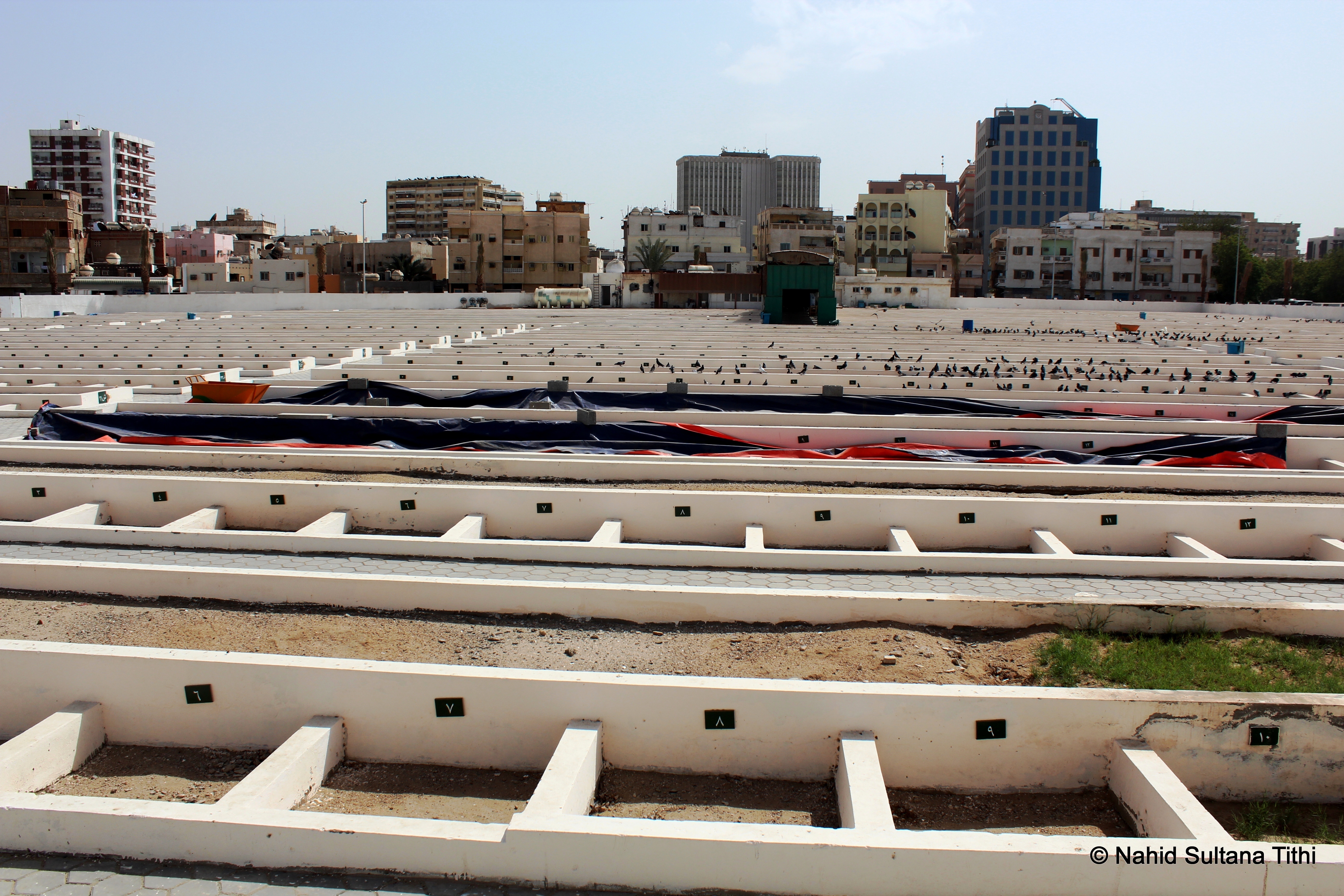 2) TOMB of EVE (HAWA AS): This is an enclosed cemetery that has many graves and is surrounded by concrete walls. This is strongly believed to the burial-place of the mother of all humankind, Eve or Hawa (AS). This is a historic archeological site of Old Jeddah. The door was closed for the tourist that day (or may be permanently). Religious authorities built the concrete wall to prevent people going there and praying at the tomb. So we ended up peeking and taking pictures of inside the cemetery by climbing the walls…hehe. Seriously, we did climb the wall to see how it looked inside. Tomb of Eve is said to be one of the longest graves there. We couldn’t pinpoint Eve’s grave since there are many long graves in that site and no graves are marked to prevent it becoming a shrine.