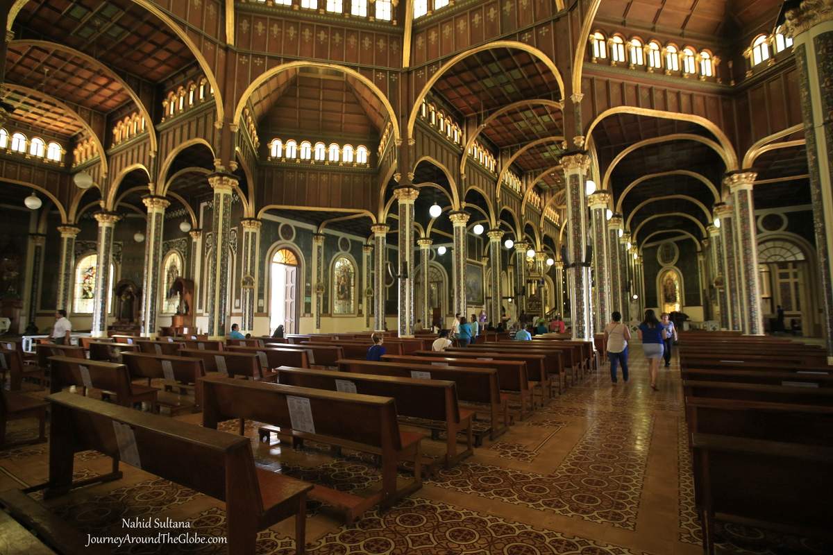 2) OUR LADY of ANGELS BASILICA in CARTAGO: About 31 km from Irazu Volcano, beside San Jose, is another city, called Cartago. This is Costa Rica’s first capital. Our bus stopped in front of a Byzantine style big church, Our Lady of Angels Basilica…we were at our second stop. Outside the basilica is very monumental, but standing here we couldn’t imagine the fabulous and majestic beauty that it holds inside. From its elegant altar to illustrious wall designs, over-sized paintings, splendid dome, wood carvings, artistic columns and floors, and stunning stained-glass windows…this Catholic church from the Spanish time is a jewel in whole Costa Rica.