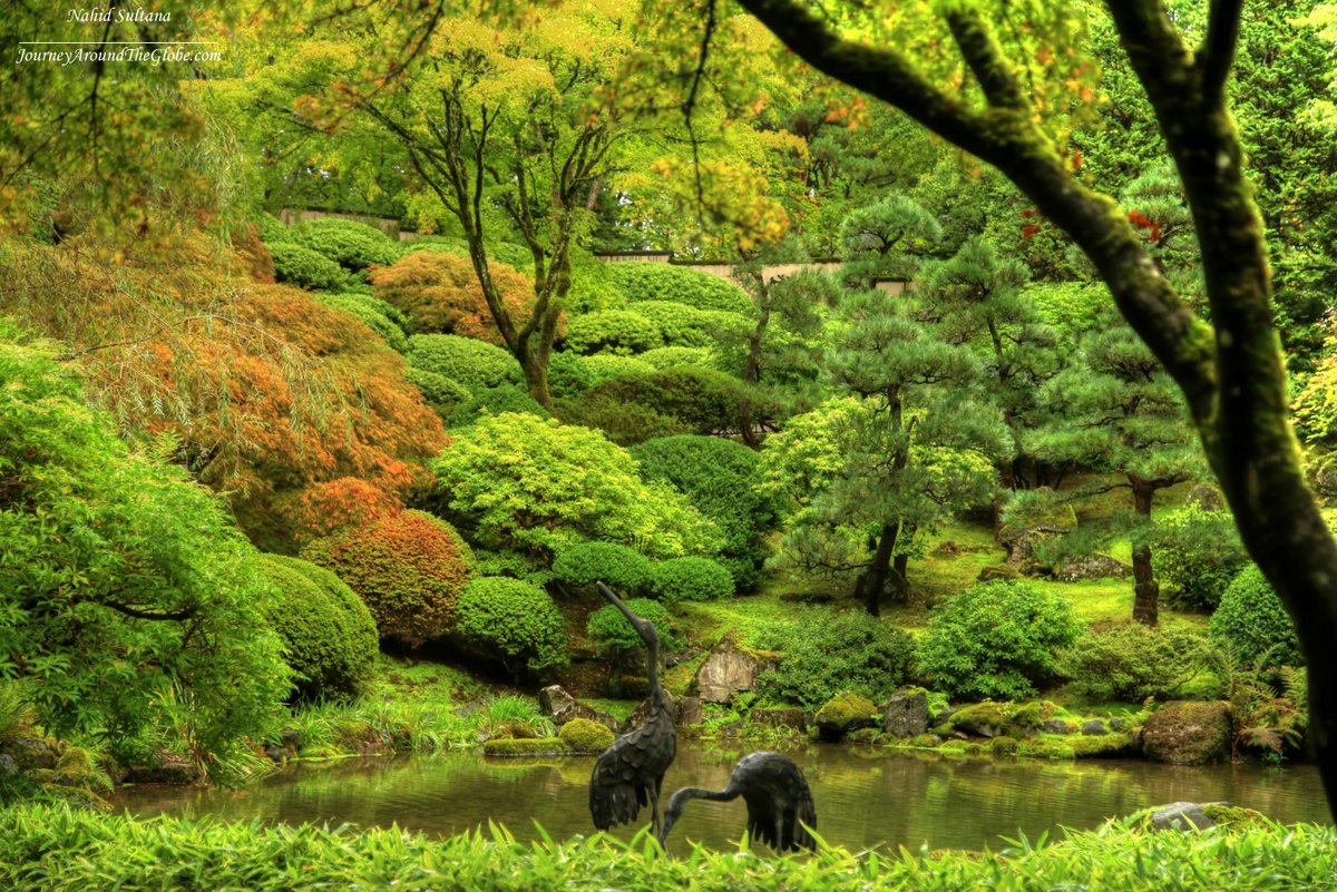 Intimate pond and crane statues in Portland Japanese Garden in Oregon